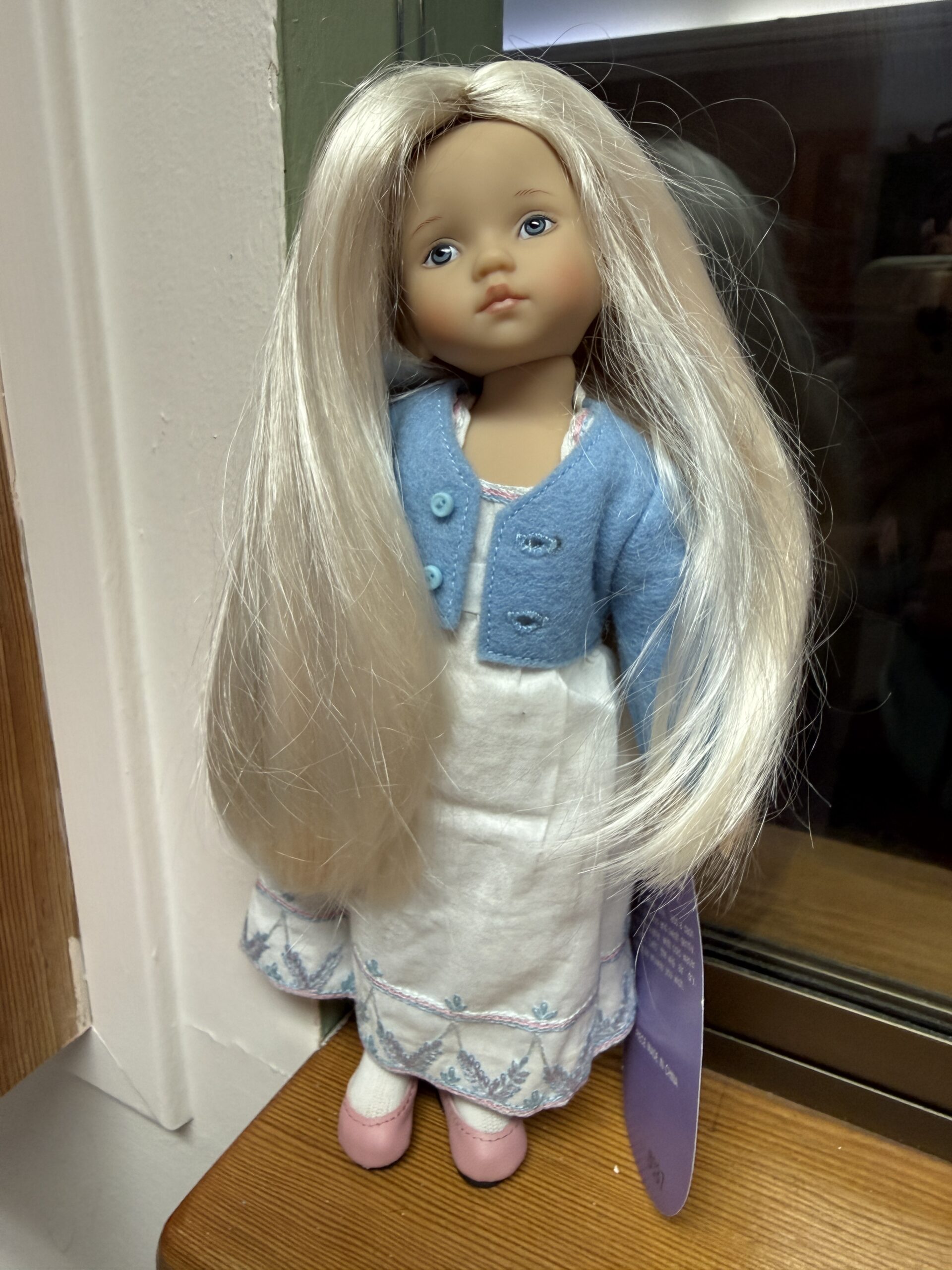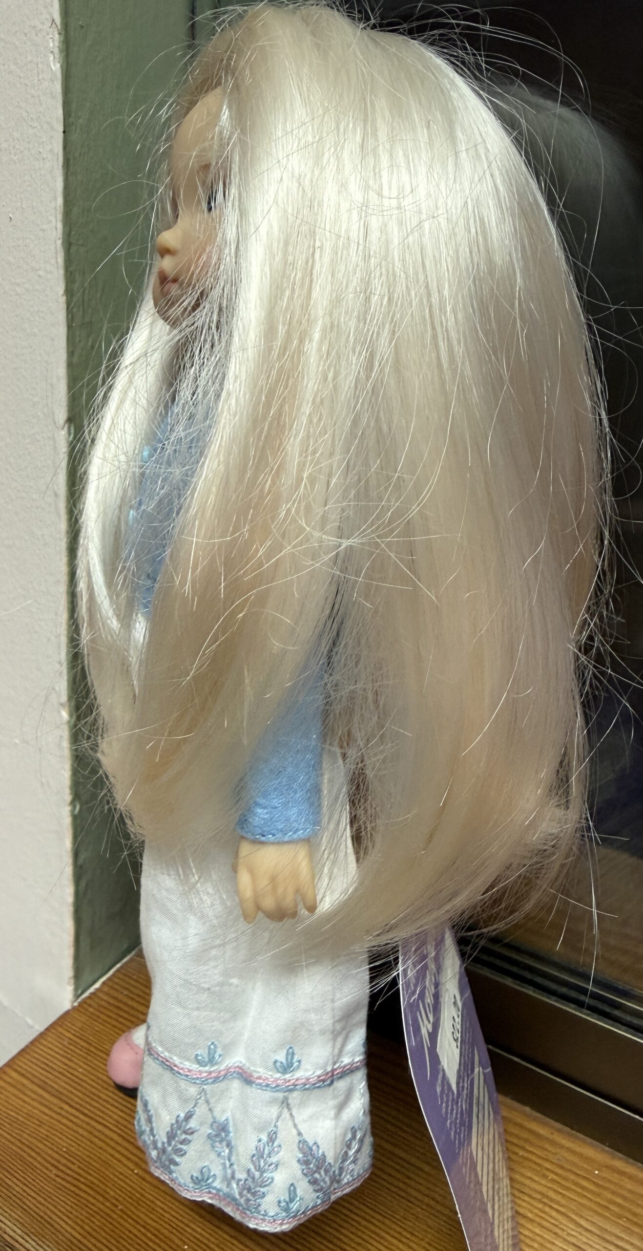 Bleach blonde synthetic mohair wig with zig-zag center part. Size 8-9.