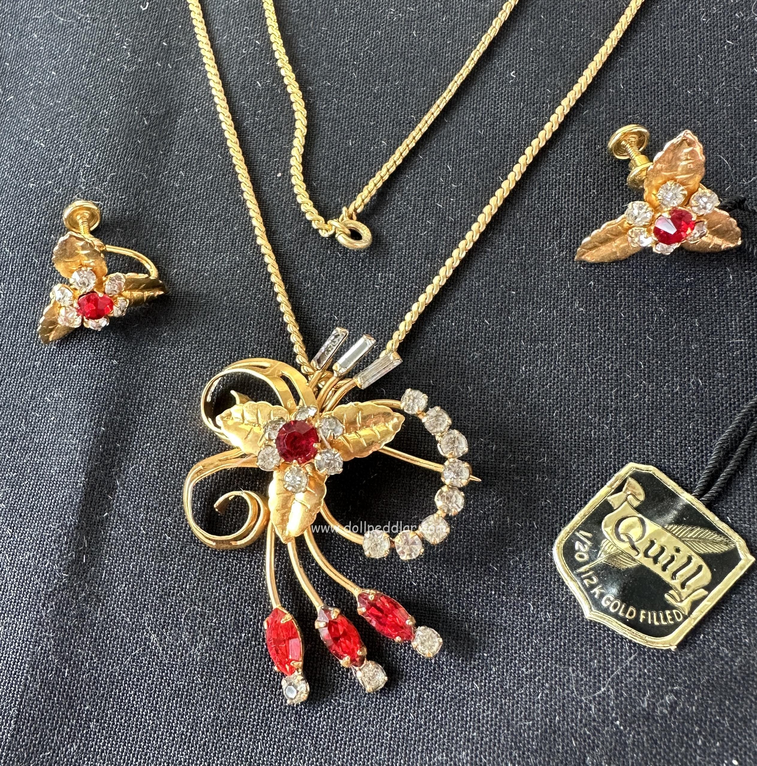 The history of the Tru-Kay jewelry brand began over 76 years ago in Lincoln, Rhode Island. Founded in February 1946, Tru-Kay Manufacturing Co. was a family business headed by Alan M. Kaufman, its president. The company handcrafted high-quality classic design jewelry using 12K and 14K gold, sterling silver, cultured pearls, genuine coral, jade, shell, Austrian crystal or rhinestones. The markings on the oval cartouche included the initials TK and the hallmark of gold. In addition, most of the jewelry sold in large stores was packaged in beautiful branded boxes with a foil tag and a stylized Tru-Kay logo.-Kay boxed set. Never out of the box. Necklace, earrings, and converts to broach.