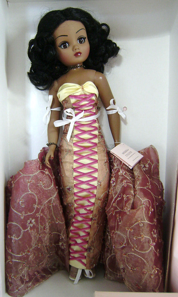 LE200. Stunning strapless dress of silk and metallic organza with ombre ribbon lacing. Accessories include clear vinyl shoes and a necklace, bracelet and earrings set. African-American doll. Each doll comes with a full set of specially designed lingerie – Gold Lycra teddy and stockings. MSRP $400